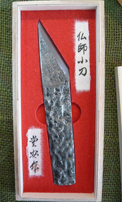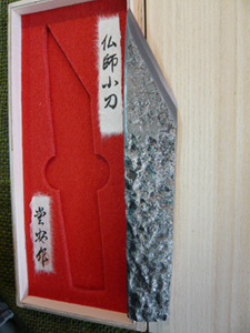 明治時代の直径8寸程の練鉄製の水道管をタテに細く割ったものを地金に使っています。従ってその横断面には若干のアールがついており、その表面の凸凹は錆が出てやせてしまった事によるものです。